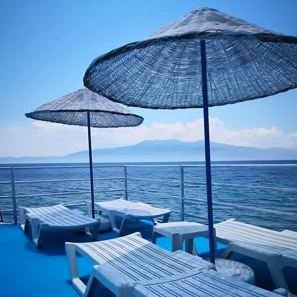 Denizin ve güneşin tadını çıkarırken 08:30 - 20:30 saatleri arasında iskele ve sahilimizde şezlong ve şemsiyelerimizden yararlanabilirsiniz.